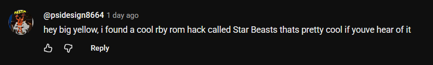 Glaring typo and 0 likes of this comment aside, the name of the hack mentioned here intrigued me. "Star Beasts". It didn't sound like it would be a subtitle, i.e. "Pokémon Star Beasts", so it seemed like it had to be something higher concept. That, plus it being particularly an RBY hack really intriguied me. At this point I was already tossing around the idea of doing a "Let's Play Thread" style event for December this year, and this sounded like it could be the perfect game to go into blind, if it really was as weird of an overhaul as it sounded like. (It was, on both accounts. But we'll get to that.)