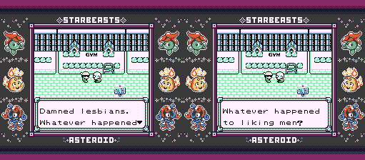 So, Grass gym full of lesbians. I guess you could argue this is just taking the subtext from the vanilla game and making it text, but I feel like whenever I've heard unfunny internet users make gags Erika's gym, they always go for the weed angle and not the lesbian angle. Maybe that has more to do with most of the humor well of Gen 1 being run dry back in the "LOL, MARIO DOES MUSHROOMS!!!!" era. I'm sure there's plenty of people drawing the obvious conclusion of "gym where only women are allowed" these days.