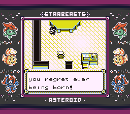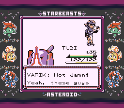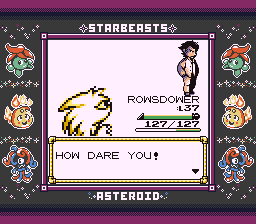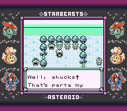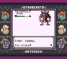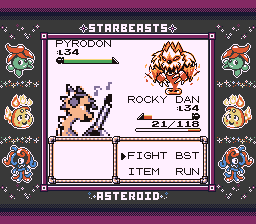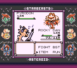 In general, the Rockets here have a lot of the Slimogg and Zapodi lines, but in general I'd say there's a bit more variety in the Beasts they use than in the originals. Stranghost, Electrio, Cracture, Tearwulf, Slasher, Eggerot, Malevolos, Tomaroc, Trapestry, O'Grue, Embalmak, Convlusia, Warnado, Ardyhydra, Infestin, Slashopper, and Deathseer were all Beasts I saw at least once on the teams of the Grunts. This game's got a lot of designs that feel "evil", thinking about it now. And if you don't remember what all of them look like, well, I guess you're just not a real Star Beasts fan.