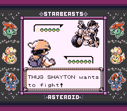 Our "gym leader" so to speak is a mean lookin' fella named Shayton, the boss of the biker gang. He seemingly wants to fight us just because I looked at him funny, but I suppose I would've challenged him to a fight either way anyways. He intends to send us packing just like "that broad with the long hair", so I guess it was him who was responsible for kicking out Sabrina. For the curious, he's still go the gym leader battle music.