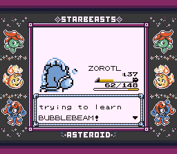 It would've maybe been funnier if I had gotten rid of Bubblebeam though, because Zorotl also scored a level up off the same Beast, and he learned Bubblebeam himself. I'm so glad to have some real Water STAB on him now.