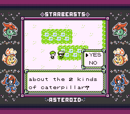 This NPC offers to helpfully explain to us about the two kind of caterpillar. According to the expert, Mulcrunch eats meat, while Cupeedle doesn't, and Mulcrunch is stronger but slower while Cupeedle is fast but "a bit flimsy". However, they're apparently both "really useful". I wonder if Shi Kong Xing Shou had two different bug families like this or if one or both of these are Star Beasts originals. Once I'm finished with the game I'll have to see if I can find a list of all of the original game's creatures so I can learn definitely who comes from where.
