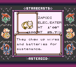 In addition to being a better way of disposing of car batteries than throwing them in the ocean, Zapodi has something of an X-Factor. Not only is Bite indeed a Dark-type move here, but Zapodi is also Electric/Dark, meaning it's already got a 60 power stab move on a pretty strong Special stat. This game doesn't have the Physical/Special split which is fine, but it does make Zapodi's other move being Screech pretty funny. Screech is actually pretty good, but as of now it has no moves that can actually make use of it. (Testing this in a Zapodi mirror match is how I got the chance to test if Phys/Spec was in the game). Oh well, just from the first couple battles using this it's already doing huge damage with Bite to things that are the same level, so I think he'll be a great addition to the team.