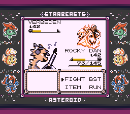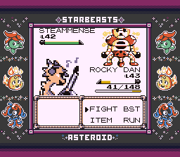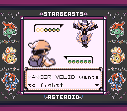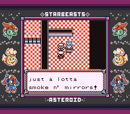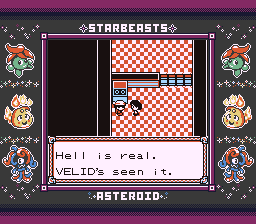 "Do you believe that Hell isn't real?" I said Yes, assuming that would be wrong, but the wording of the question is very poor. It should really just say "Is Hell real?", since as-written it's asking me what my belief is. If it is True that I believe Hell isn't real, answering Yes should be correct whether or not it's actually real, because that's not what the question asked. This is the only bad part about Star Beasts. Everything else is perfect but I would change this one thing. But it is pretty entertaining comedic timing to get this question wrong and then have this NPC walk up and say "Hell is real." After the battle, she mentions that every once and awhile Velid will wake up screaming in the middle of the night about the things he saw, but none of the gym trainers can do anything to help him. This does make me wonder where Velid and the rest of these people sleep and what their relationship is, but it's a cute detail to mention stuff like this that suggests these NPCs having life outside where we see them here.