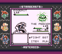 All Eggerot got to accomplish was missing a Poison Gas before it just got Wrapped out of the game. This is still better than the fate suffered by her other two Starbies, who were both also new, and who both never got to take a single action since they were slower than The Peeker and I never missed a Wrap (I did use every single one of The Peeker's Wrap PP except for 1 in this fight though). This is the downside of the Wrap strategy, I suppose: I never actually get a chance to learn what any of these Starbies can actually do.