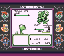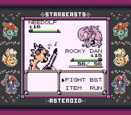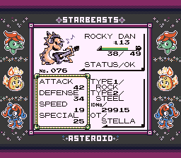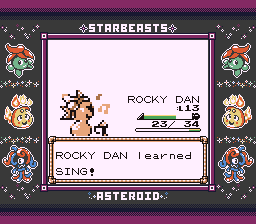 Mosston here seems to be Grass/Rock, which is not a type our team is very well set up to beat. Not only does its moveset have Screech to push lots of damage on any Beast I plan on leaving in for a long time, but it's also got Rest, which does a pretty good job at shutting down any Wrap based strategies since one miss is enough to let it heal back to full health (and they do so little damage that it's very likely that one will miss eventually with so many being needed). Luckily, I just acquired a hammer, and this problem looks a lot like a nail, so Rocky Dan was able to take it down with some Screeches of his own (he learned Screech when he evolved btw). After two Screeches, even a not very effective Tackle did half of Mosston's health. Pretty brutal. The only downside to this strategy is both Starbies using Screech at each other was quite hard on the ears, since Screech in RBY has a pretty horrible sound effect.