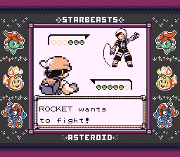 It took me a second to figure out where I recognized this sprite from: It's based on Tabitha's sprite from RSE. (Or just RE, I guess). This is a good sprite, the hood looks great, although out of all the things I could encounter in this dungeon that starts with "ROCKE", "ROCKET" is the one I wanted to see less. His team was Bokongo, Manhandla, and Whirlie, which gives some support to the "Manhandla is the Zubat equivalent" theory, although it's worth noting that there don't seem to be any in Mt. Moon.