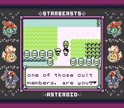 The NPC at the end of the route provides additional commentary on these two, asking "You're not one of those cult members, are you?" and adding after the battle that "Those NEPUTAIL fan club guys freak me out..." In context, with it being called a "fan club" here it's pretty easy to interpret the "cult member" bit as this guy just mocking them for behaving weirdly. But considering the gibberish text (and some paranthetical narration saying explicitly that the player can't understand what they're saying), I'm pretty inclined to take this at face value. We'll definitely learn more about this later, with this name drop of "Neputail" and ("NepuBadge" being one of the badge names we saw earlier).