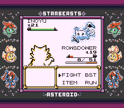 Another great sprite, I assume from context this is Splashee's evolved form. It's got Powder Snow, which is kind of novel and would be real bad news if I was planning on countering this gym with a Grass type. If I can't use my Electric type though (and since XMVSF is warming the bench right now) we're going with the Wrap brigade on this one. The Peeker's Wrap, as ever, does quite low damage, so I needed some paralysis support from Toby Kebel to take this thing down. What I didn't expect was, after the Glare and getting a full paralysis afterwards, Toby Kebel just soloed the whole fight with Wrap and Inoyu never got to take another action. I need to stop doubting my GOAT.