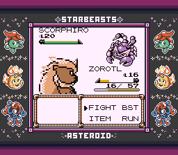 Fighting through the trainers on this route has really proven to me just how incredibly powerful Zorotl is. STAB Horn Attack is a pretty great move for this point in the game, and he's got incredibly solid stats to back it up: Even a super-effective Thundershock from an enemy would've only been a 3-hit-KO. Other than things that resist it, it's been able to consistently two-hit or even one-hit KO the enemies here with Horn Attack, and I'm even below them in level. Here's one of the things that did resist Horn Attack though: It looks like the evolution of Scorpsy, who I'm fairly certain was Bug/Poison, so I'm not sure what this is beyond "probably Steel, I guess".